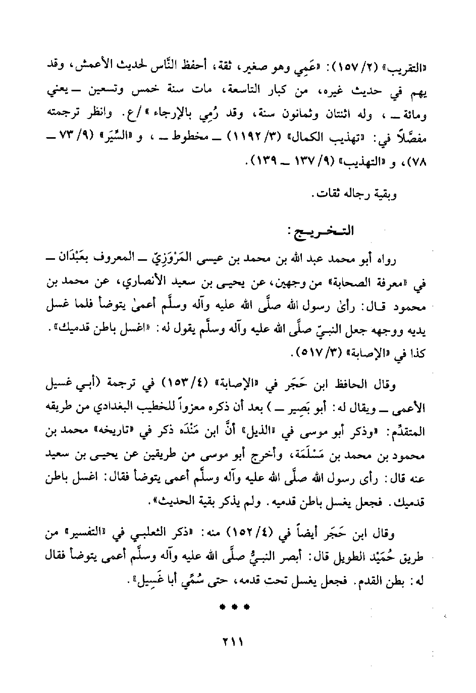 وقال الحافظ ابن حَجَر في "الإصابة" (٤/ ١٥٣) في ترجمة (أبي غسيل الأعمى -ويقال له: أبو بَصِير-) بعد أن ذكره معزوًا للخطيب البغدادي من طريقه المتقدِّم: "وذكر أبو موسى في "الذيل" أنَّ ابن مَنْدَه ذكر في "تاريخه" محمد بن محمود بن محمد بن مَسْلَمَة، وأخرج أبو موسى من طريقين عن يحيى بن سعيد عنه قال: رأى رسول اللَّه صلَّى اللَّه عليه وآله وسلَّم أعمى يتوضأ فقال: اغسل باطن قدميك. فجعل يغسل باطن قدميه، ولم يذكر بقية الحديث".