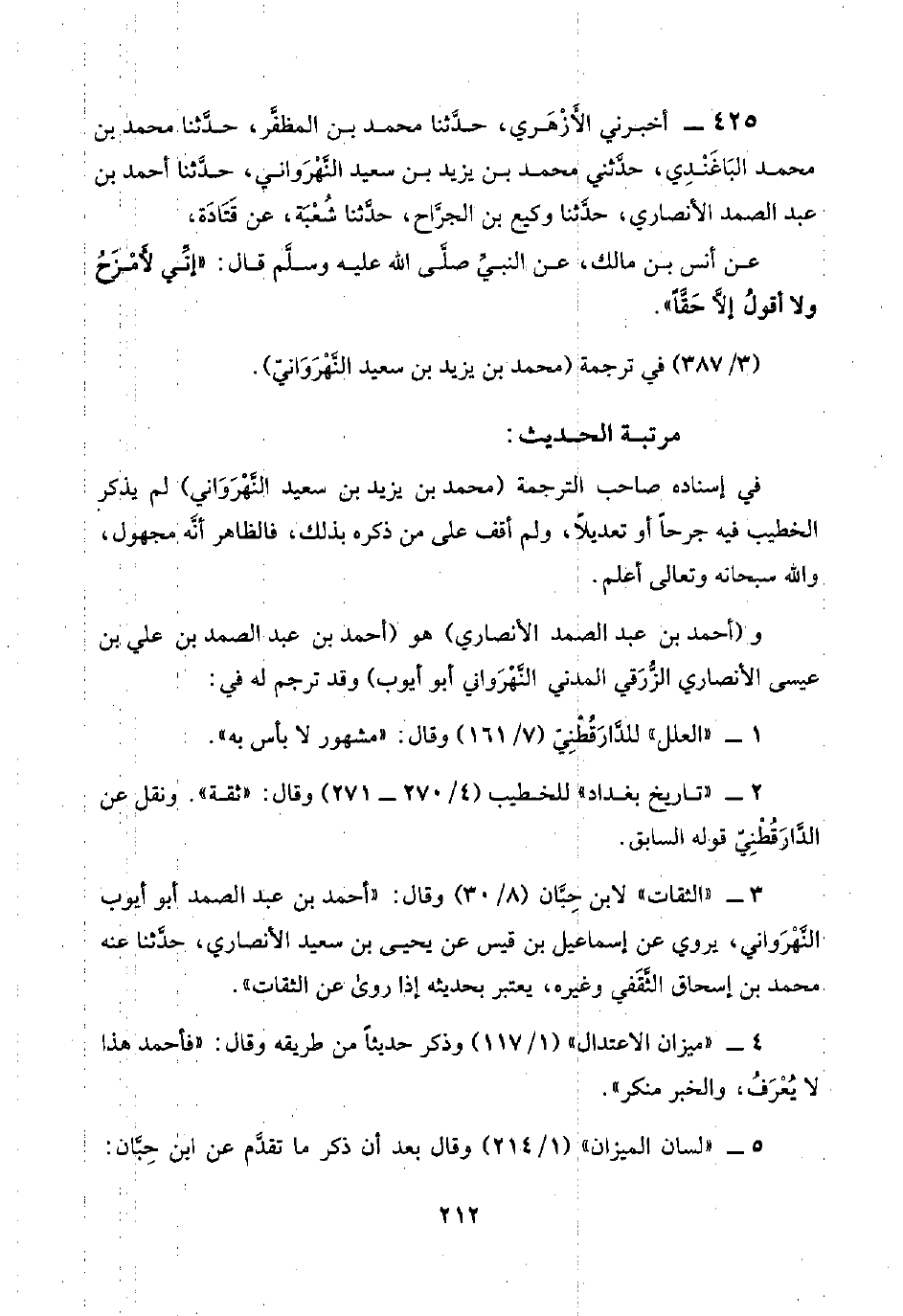 ٤٢٥ - أخبرني الأَزْهَري، حدَّثنا محمد بن المظفَّر، حدَّثنا محمد بن محمد البَاغَنْدِي، حدَّثني محمد بن يزيد بن سعيد النَّهْرَواني، حدَّثنا أحمد بن عبد الصمد الأنصاري، حدَّثنا وكيع بن الجرَّاح، حدَّثنا شُعْبَة، عن قَتَادَة،