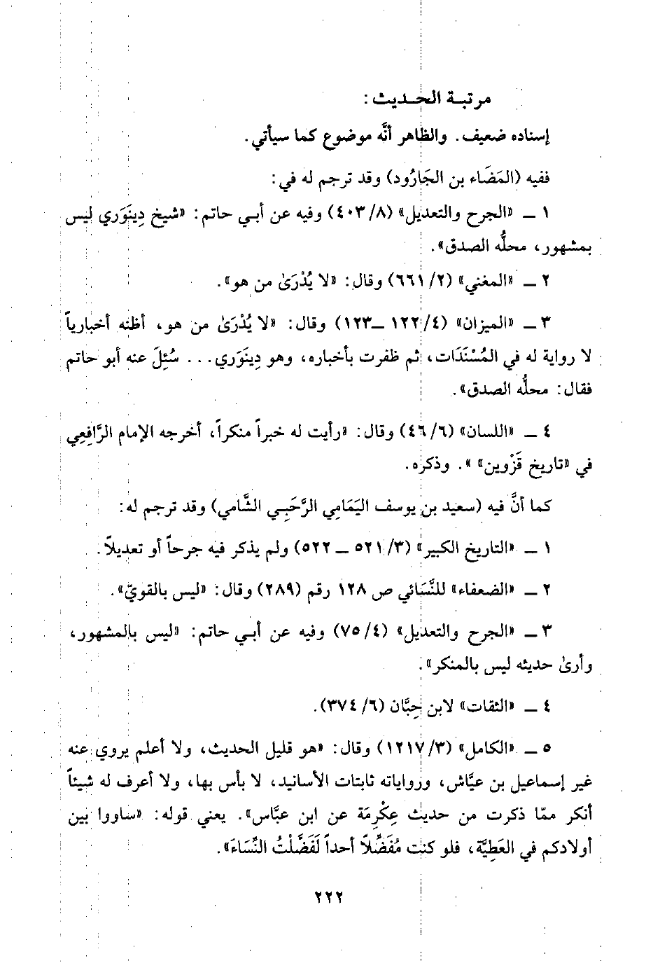 ٥ - "الكامل" (٣/ ١٢١٧) وقال: "هو قليل الحديث، ولا أعلم يروي عنه غير إسماعيل بن عيَّاش، ورواياته ثابتات الأسانيد، لا بأس بها، ولا أعرف له شيئًا أنكر ممّا ذكرت من حديث عِكْرِمَة عن ابن عبَّاس". يعني قوله: "ساووا بين أولادكم في العَطِيَّة، فلو كنت مُفَضِّلًا أحدًا لَفَضَّلْتُ النِّسَاءَ".