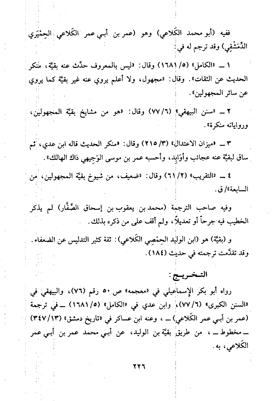 ٣ - "ميزان الاعتدال" (٣/ ٢١٥) وقال: "منكر الحديث قاله ابن عدي، ثم ساق لبقيَّة عنه عجائب وأوَابِد، وأحسبه عمر بن موسى الوَجِيهي ذاك الهالك".