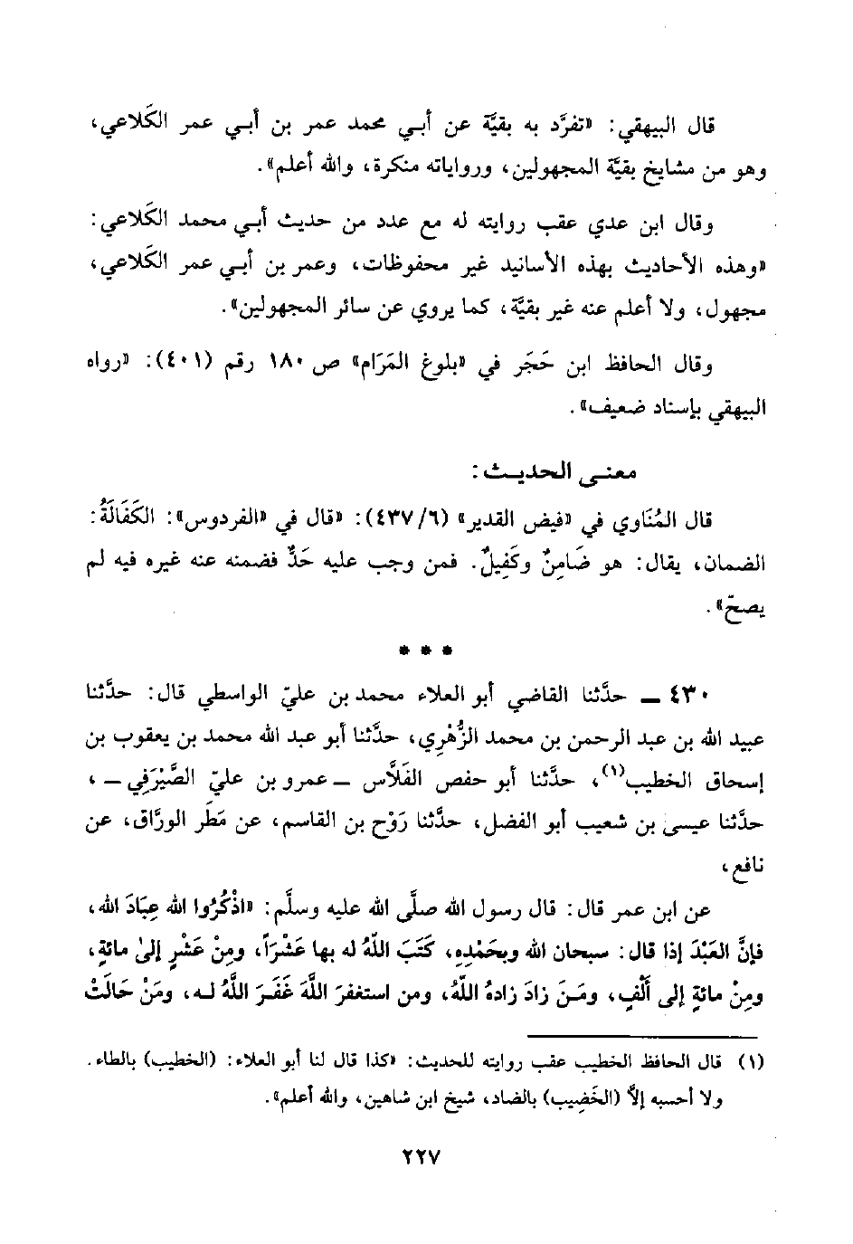 قال البيهقي: "تفرَّد به بقيَّة عن أبي محمد عمر بن أبي عمر الكَلاعي، وهو من مشايخ بقيَّة المجهولين، ورواياته منكرة، واللَّه أعلم".