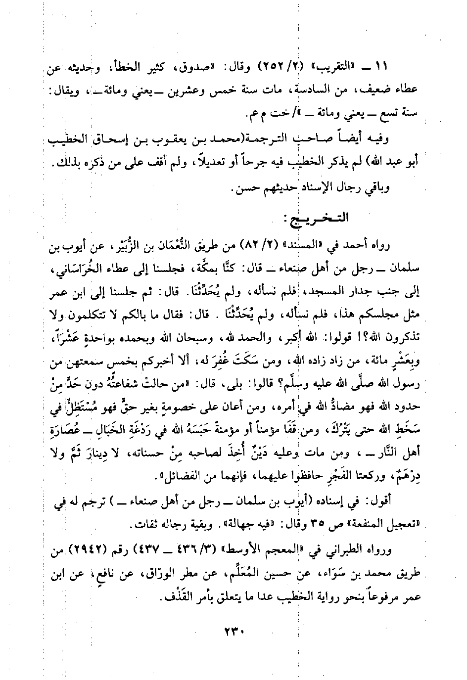 رواه أحمد في "المسند" (٢/ ٨٢) من طريق النُّعْمَان بن الزُّبَيْر، عن أيوب بن سلمان -رجل من أهل صنعاء- قال: كنّا بمكَّة، فجلسنا إلى عطاء الخُرَاسَاني، إلى جنب جدار المسجد، فلم نسأله، ولم يُحَدِّثْنَا. قال: ثم جلسنا إلى ابن عمر مثل مجلسكم هذا، فلم نسأله، ولم يُحَدِّثْنَا. قال: فقال ما بالكم لا تتكلمون ولا تذكرون اللَّه؟ ! قولوا: اللَّه أكبر، والحمد للَّه، وسبحان اللَّه وبحمده بواحدةٍ عَشْرًا، وبِعَشْرٍ مائة، من زاد زاده اللَّه، ومن سَكَتَ غُفِرَ له، ألا أخبركم بخمسٍ سمعتهن من رسول اللَّه صلَّى اللَّه عليه وسلَّم؟ قالوا: بلى، قال: "من حالتْ شفاعتُهُ دون حَدٍّ مِنْ حدود اللَّه فهو مضادُّ اللَّه في أمره، ومن أعان على خصومةٍ بغير حقٍّ فهو مُسْتَظِلٌّ في سَخَطِ اللَّه حتى يَتْرُكَ، ومن قَفَا مؤمنًا أو مؤمنةً حَبَسَهُ اللَّه في رَدْغَةِ الخَبَالِ -عُصَارِةِ أهل النَّار-، ومن مات وعليه دَيْنٌ أُخِذَ لصاحبه مِنْ حسناته، لا دِينارَ ثَمَّ ولا دِرْهَمٌ، وركعتا الفَجْرِ حافظوا عليهما، فإنهما من الفضائل".
