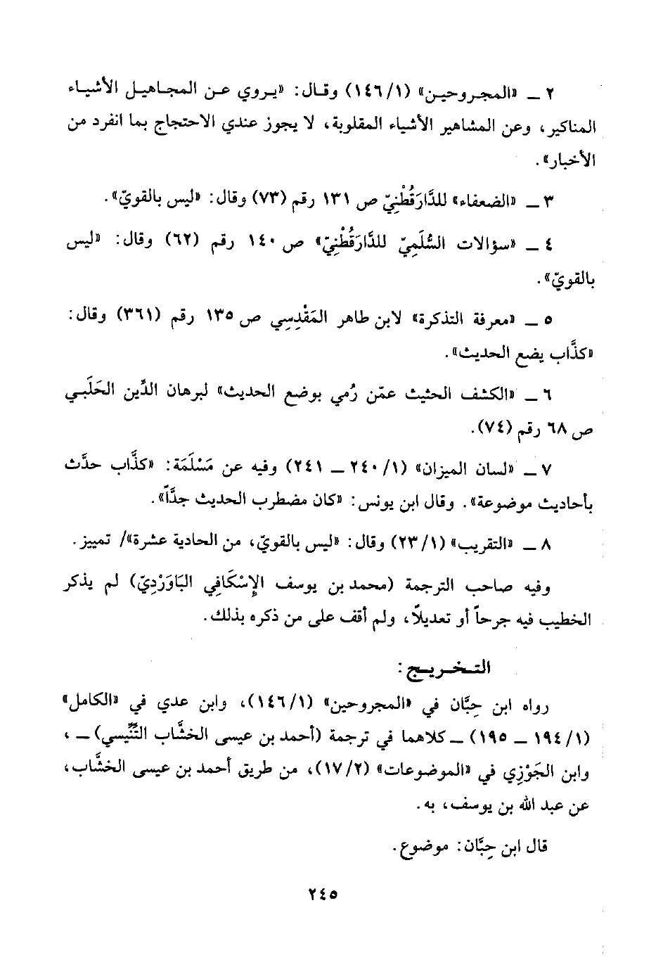 ٧ - "لسان الميزان" (١/ ٢٤٠ - ٢٤١) وفيه عن مَسْلَمَة: "كذَّاب حدَّث بأحاديث موضوعة". وقال ابن يونس: "كان مضطرب الحديث جدًّا".