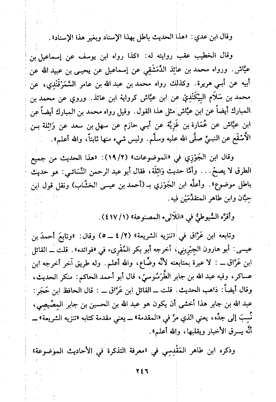 وقال ابن الجَوْزِي في "الموضوعات" (٢/ ١٩): "هذا الحديث من جميع الطرق لا يصحّ. . . وأمَّا حديث وَاثِلَة، فقال أبو عبد الرحمن النَّسَائي: هو حديث باطل موضوع". وأعلَّه ابن الجَوْزي بـ (أحمد بن عيسى الخشَّاب) ونقل قول ابن حِبَّان وابن طاهر المتقدِّمَيْن فيه.