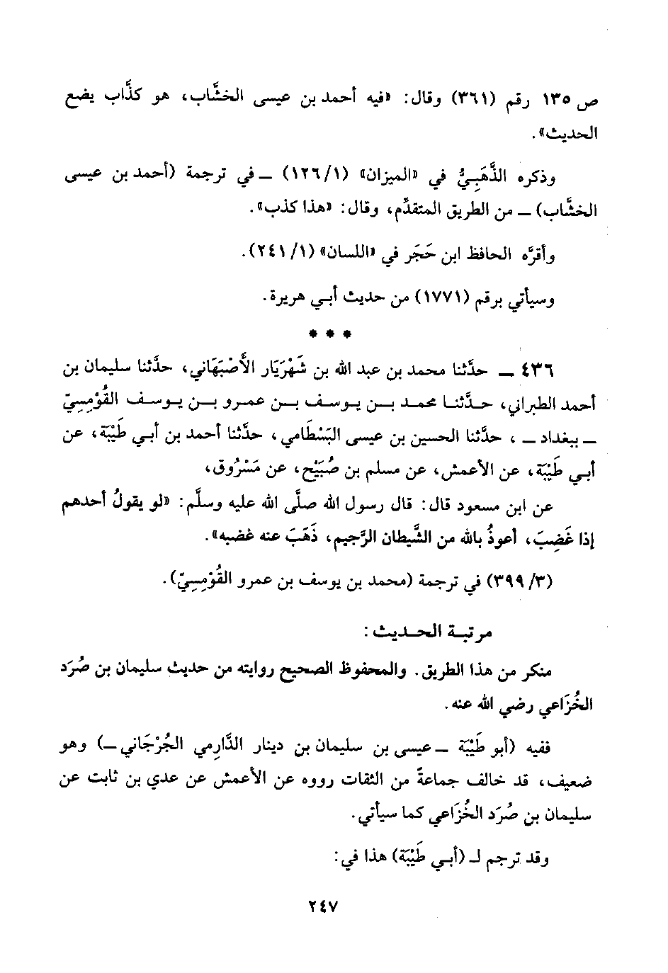 ٤٣٦ - حدَّثنا محمد بن عبد اللَّه بن شَهْرَيَار الأَصْبَهَاني، حدَّثنا سليمان بن أحمد الطبراني، حدَّثنا محمد بن يوسف بن عمرو بن يوسف القُوْمِسِيّ -ببغداد-، حدَّثنا الحسين بن عيسى البَسْطَامي، حدَّثنا أحمد بن أبي طَيْبَة، عن أبي طَيْبَة، عن الأعمش، عن مسلم بن صُبَيْح، عن مَسْرُوق،