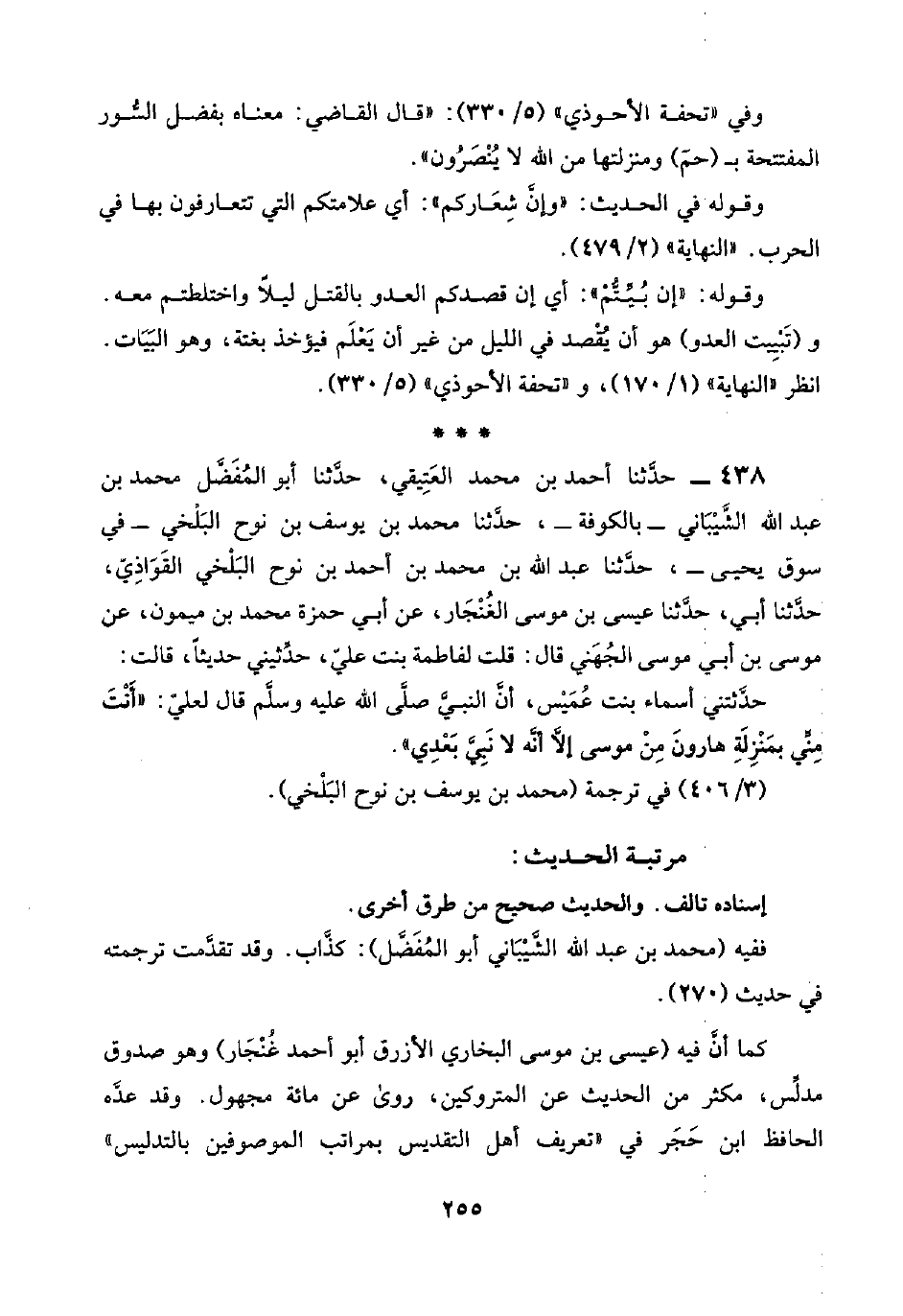 ٤٣٨ - حدَّثنا أحمد بن محمد العَتِيقي، حدَّثنا أبو المُفَضَّل محمد بن عبد اللَّه الشَّيْبَاني -بالكوفة-، حدَّثنا محمد بن يوسف بن نوح البَلْخي -في سوق يحيى-، حدَّثنا عبد اللَّه بن محمد بن أحمد بن نوح البَلْخي القَوَاذِيّ، حدَّثنا أبي، حدَّثنا عيسى بن موسى الغُنْجَار، عن أبي حمزة محمد بن ميمون، عن موسى بن أبي موسى الجُهَني قال: قلت لفاطمة بنت عليّ، حدِّثيني حديثًا، قالت: