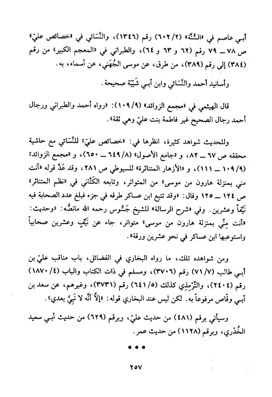ومن شواهده تلك، ما رواه البخاري في الفضائل، باب مناقب عليّ بن أبي طالب (٧/ ٧١) رقم (٣٧٠٦)، ومسلم في ذات الكتاب والباب (٤/ ١٨٧٠) رقم (٢٤٠٤)، والتِّرْمِذِي كذلك (٥/ ٦٤١) رقم (٣٧٣١)، وغيرهم، عن سعد بن أبي وقّاص مرفوعًا به. لكن ليس عند البخاري قوله: "إلَّا أنَّه لا نَبِيَّ بعدي".