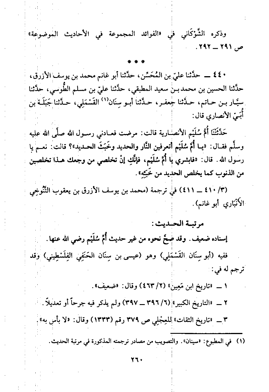 حَدَّثَتْنَا أُمُّ سُلَيْم الأنصارية قالت: مرضت فعادني رسول اللَّه صلَّى اللَّه عليه وسلَّم فقال: "يا أُمَّ سُلَيْم أتعرفين النَّار والحديد وخَبَثَ الحديد"؟ قالت: نعم يا رسول اللَّه. قال: "فابشري يا أُمَّ سُلَيْم، فإنَّكِ إنْ تخلصي من وجعك هذا تخلصين من الذنوب كما يخلص الحديد من خَبَثِهِ".
