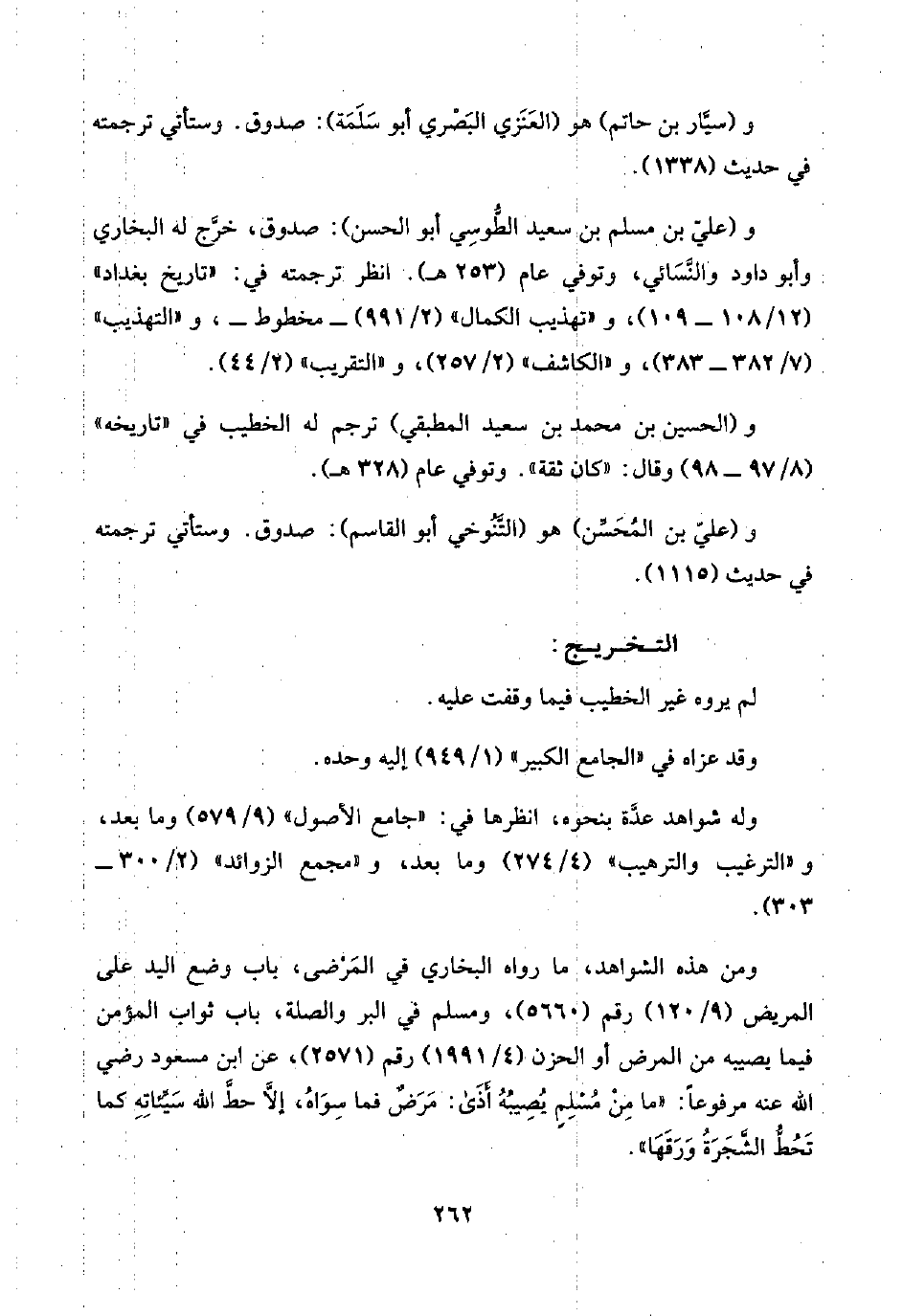 ومن هذه الشواهد، ما رواه البخاري في الماضي، باب وضع اليد على المريض (٩/ ١٢٠) رقم (٥٦٦٠)، ومسلم في البر والصلة، باب ثواب المؤمن فيما يصيبه من المرض أو الحزن (٤/ ١٩٩١) رقم (٢٥٧١)، عن ابن مسعود رضي اللَّه عنه مرفوعًا: "ما مِنْ مُسْلِمٍ يُصِيبُهُ أَذَى: مَرَضٌ فما سِوَاهُ، إلَّا حطَّ اللَّه سَيِّئاتِهِ كما تَحُطُّ الشَّجَرَةُ وَرَقَهَا".