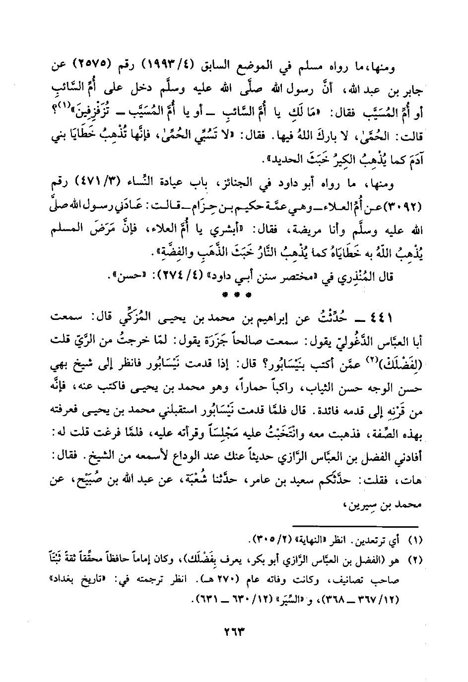 ٤٤١ - حُدِّثْثُ عن إبراهيم بن محمد بن يحيى المُزَكِّي قال: سمعت أبا العبَّاس الدَّغُوليّ يقول: سمعت صالحًا جَزَرَة يقول: لمّا خرجتُ من الرَّيّ قلت (لفَضْلَكْ) (¬٢) عمَّن أكتب بنَيْسَابُور؟ قال: إذا قدمت نَيْسَابُور فانظر إلى شيخ بهي حسن الوجه حسن الثياب، راكبًا حمارًا، وهو محمد بن يحيى فاكتب عنه، فإنَّه من قَرْنِهِ إلى قدمه فائدة. قال فلمَّا قدمت نَيْسَابُور استقبلني محمد بن يحيى فعرفته بهذه الصِّفة، فذهبت معه وانْتَخَبْتُ عليه مَجْلِسًا وقرأته عليه، فلمَّا فرغت قلت له: أفادني الفضل بن العبَّاس الرَّازي حديثًا عنك عند الوداع لأسمعه من الشيخ. فقال: هات، فقلت: حدَّثَكم سعيد بن عامر، حدَّثنا شُعْبَة، عن عبد اللَّه بن صُبَيْح، عن محمد بن سِيرين،