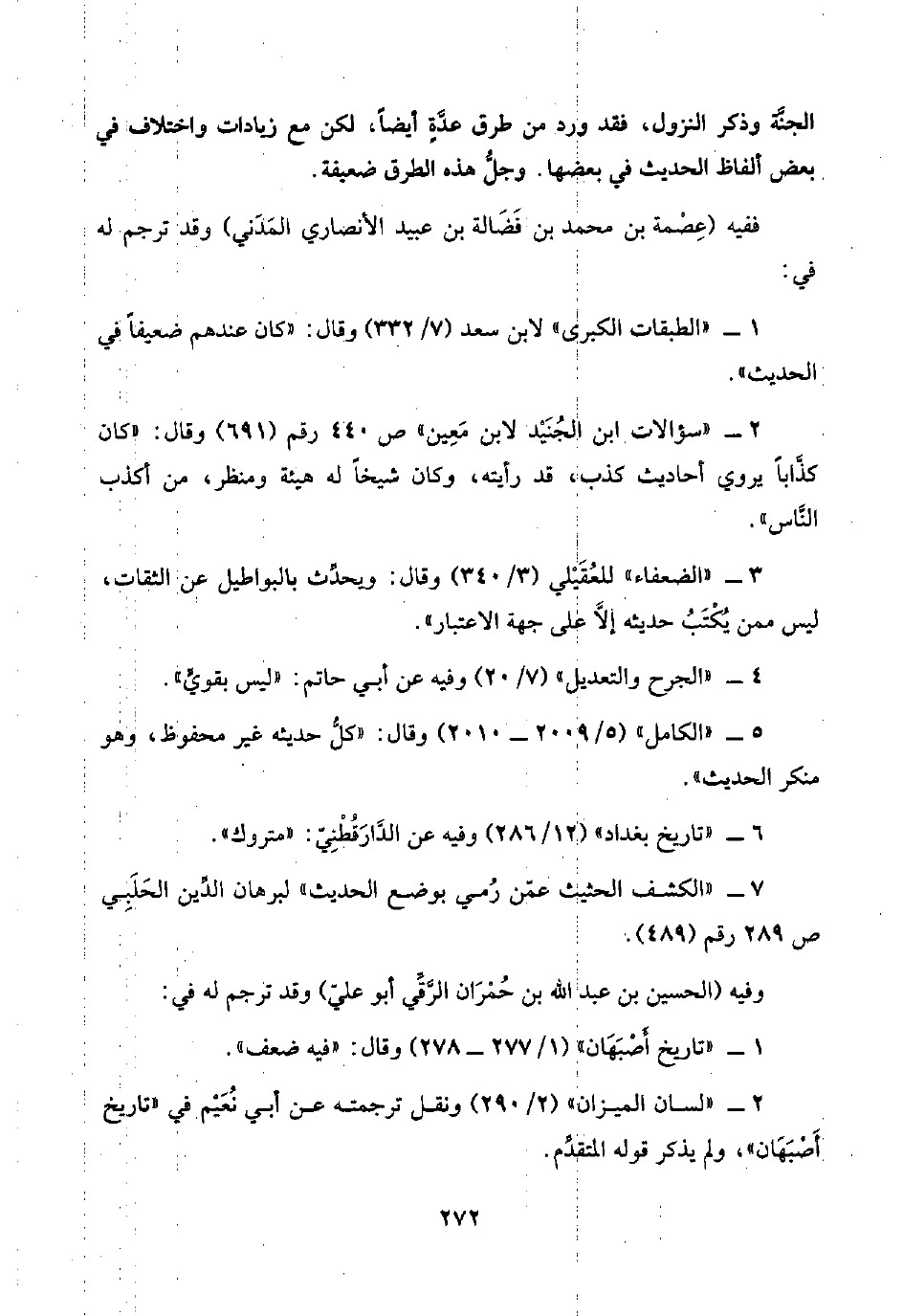 الجنَّة وذكر النزول، فقد ورد من طرق عدَّةٍ أيضًا، لكن مع زيادات واختلاف في بعض ألفاظ الحديث في بعضها. وجلُّ هذه الطرق ضعيفة.