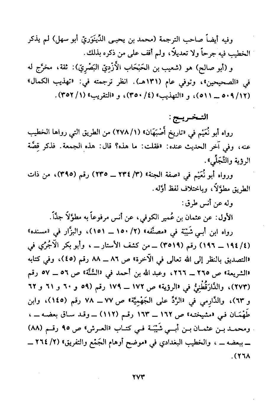 رواه ابن أبي شَيْبَة في "مصنَّفه" (٢/ ١٥٠ - ١٥١)، والبزَّار في "مسنده" (٤/ ١٩٤ - ١٩٦) رقم (٣٥١٩) -من كشف الأستار-، وأبو بكر الآجُرِّي في "التصديق بالنظر إلى اللَّه تعالى في الآخرة" ص ٨٦ - ٨٨ رقم (٤٥)، وفي كتابه "الشريعة" ص ٢٦٥ - ٢٦٦، وعبد اللَّه بن أحمد في "السُّنَّة" ص ٥٦ - ٥٧ رقم (٢٧٣)، والدَّارَقُطْنِيُّ في "الرؤية" ص ١٦٢ - ١٦٣ رقم (٥٩ و ٦٠ و ٦١ و ٦٢ و ٦٣)، والدَّارِمي في "الرَّدِّ على الجَهْمِيَّة" ص ٧٧ - ٧٨ رقم (١٤٥)، وابن طَهْمَان في "مشيخته" ص ١٦٢ - ١٦٣ رقم (١١٢) -وقد ساق بعضه-، ومحمد بن عثمان بن أبي شَيْبَة في كتاب "العرش" ص ٩٥ رقم (٨٨) -ببعضه-، والخطيب البغدادي في "موضح أوهام الجَمْع والتفريق" (٢/ ٢٦٤ - ٢٦٨).