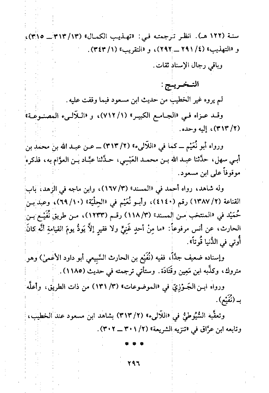 وتعقَّبه السُّيُوطِيُّ في "اللآلئ" (٢/ ٣١٣) بشاهد ابن مسعود عند الخطيب، وتابعه ابن عَرَّاق في "تنزيه الشريعة" (٢/ ٣٠١ - ٣٠٢).