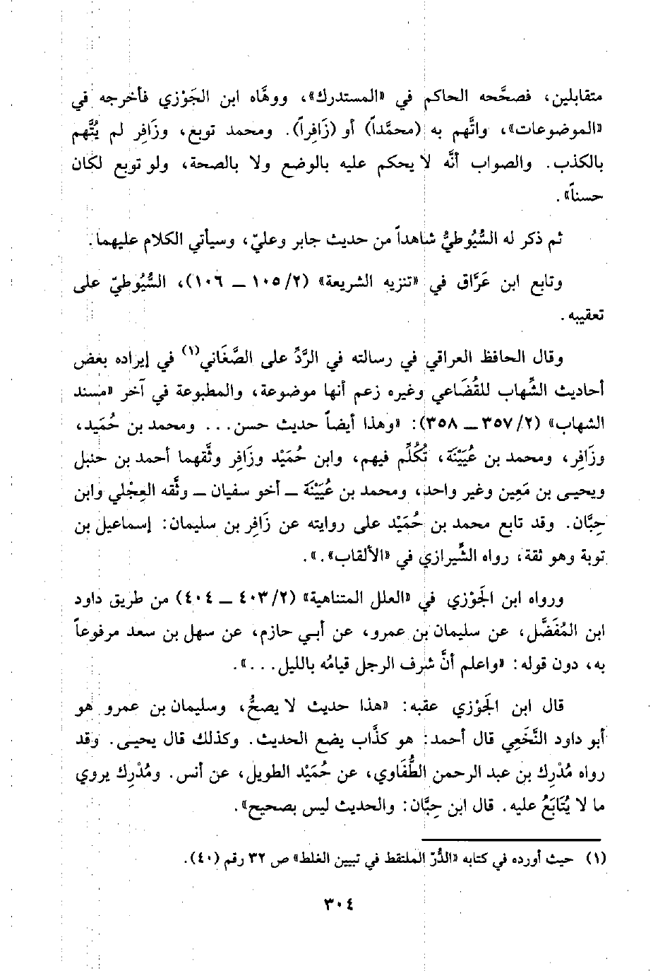 وقال الحافظ العِرَاقي في رسالته في الرَّدِّ على الصَّغَاني (¬١) في إيراده بعض أحاديث الشِّهاب للقُضَاعي وغيره زعم أنَّها موضوعة، والمطبوعة في آخر "مسند الشهاب" (٢/ ٣٥٧ - ٣٥٨): "وهذا أيضًا حديث حسن. . . ومحمد بن حُمَيْد، وزَافِر، ومحمد بن عُيَيْنَة، تُكُلِّم فيهم، وابن حُمَيْد وزَافِر وثَّقهما أحمد بن حنبل ويحيى بن مَعِين وغير واحد، ومحمد بن عُيَيْنَة -أخو سفيان- وثَّقه العِجْلي وابن حِبَّان. وقد تابع محمد بن حُمَيْد على روايته عن زَافِر بن سليمان: إسماعيل بن توبة وهو ثقة، رواه الشِّيرازي في "الألقاب".".