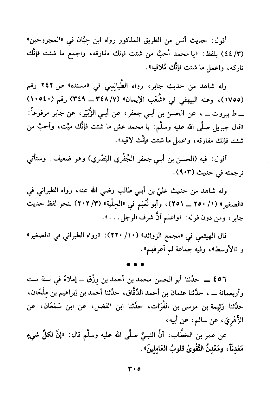 أقول: حديث أنس من الطريق المذكور رواه ابن حِبَّان في "المجروحين" (٣/ ٤٤) بلفظ: "يا محمد أحبَّ من شئت فإنك مفارقه، واجمع ما شئت فإنَّك تاركهـ، واعمل ما شئت فإنَّك مُلاقيه".