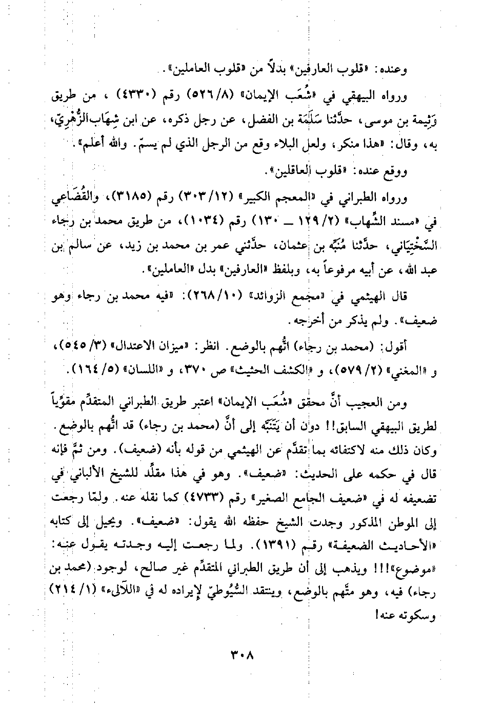 ومن العجيب أنَّ محقق "شُعَب الإيمان" اعتبر طريق الطبراني المتقدِّم مقوِّيًا لطريق البيهقي السابق! ! دون أن يَتَنَبَّه إلى أنَّ (محمد بن رجاء) قد اتُّهم بالوضع. وكان ذلك منه لاكتفائه بما تقدَّم عن الهيثمي من قوله بأنه (ضعيف). ومن ثمَّ فإنَّه قال في حكمه على الحديث: "ضعيف". وهو في هذا مقلِّد للشيخ الألباني في تضعيفه له في "ضعيف الجامع الصغير" رقم (٤٧٣٣) كما نقله عنه. ولمّا رجعت إلى الموطن المذكور وجدت الشيخ حفظه اللَّه يقول: "ضعيف". ويحيل إلى كتابه "الأحاديث الضعيفة" رقم (١٣٩١). ولما رجعت إليه وجدته يقول عنه: "موضوع"! ! ! ويذهب إلى أن طريق الطبراني المتقدِّم غير صالح، لوجود (محمد بن رجاء) فيه، وهو متَّهم بالوضع، وينتقد السُّيُوطيّ لإيراده له في "اللآلئ" (١/ ٢١٤) وسكوته عنه!