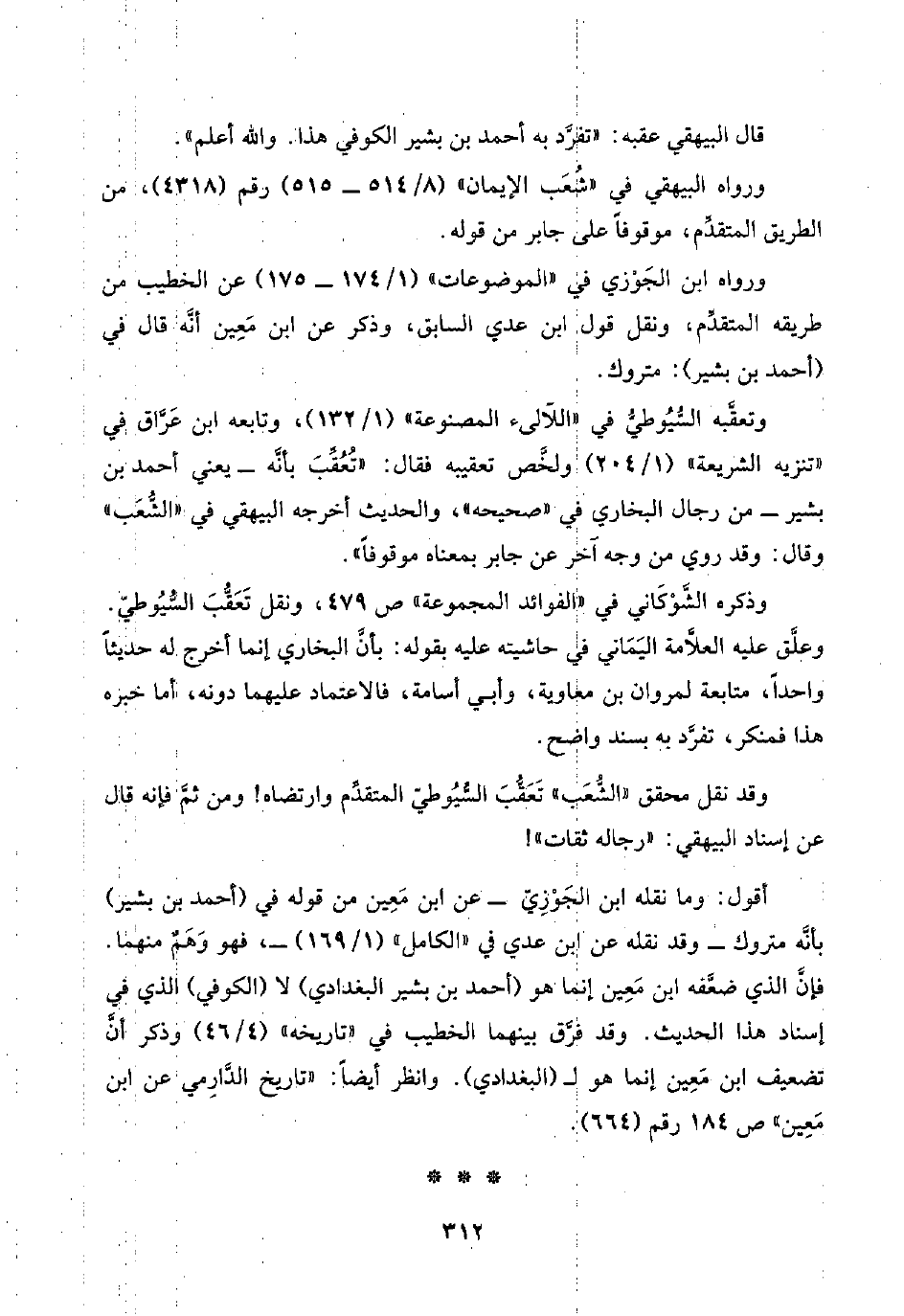 وتعقَّبه السُّيُوطِيُّ في "اللآلئ المصنوعة" (١/ ١٣٢)، وتابعه ابن عَرَّاق في "تنزيه الشريعة" (١/ ٢٠٤) ولخَّص تعقيبه فقال: "تُعُقِّبَ بأنَّه -يعني أحمد بن بشير- من رجال البخاري في "صحيحه"، والحديث أخرجه البيهقي في "الشُّعَب" وقال: وقد روي من وجه آخر عن جابر بمعناه موقوفًا".