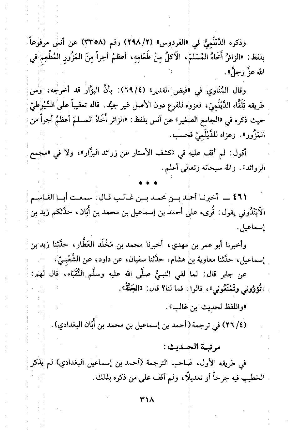 وقال المُنَاوي في "فيض القدير" (٤/ ٦٩): بأنَّ البزَّار قد أخرجه، ومن طريقه تَلَقَّاه الدَّيْلَمِيّ، فعزوه للفرع دون الأصل غير جيِّد. قاله تعقيبًا على السُّيُوطِيّ حيث ذكره في "الجامع الصغير" عن أنس بلفظ: "الزائر أَخَاهُ المسلمَ أعظمُ أجرًا من المَزُور". وعزاه للدَّيْلَمِيّ فحسب.