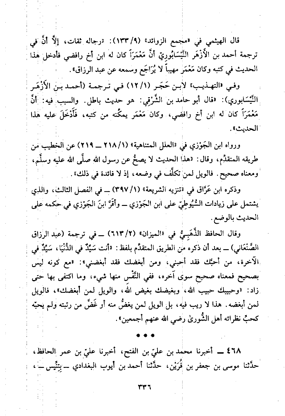 وقال الحافظ الذَّهَبِيُّ في "الميزان" (٢/ ٦١٣) -في ترجمة (عبد الرزاق الصَّنْعَاني) - بعد أن ذكره من الطريق المتقدِّم بلفظ: "أنت سَيِّدٌ في الدُّنْيَا، سَيِّدٌ في الآخرة، من أحبَّك فقد أحبني، ومن أبغضك فقد أبغضني": "مع كونه ليس بصحيح فمعناه صحيح سوى آخره، ففي النَّفْسِ منها شيء، وما اكتفى بها حتى زاد: "وحبيبك حبيب اللَّه، وبغيضك بغيض اللَّه، والويل لمن أبغضك"، فالويل لمن أبغضه. هذا لا ريب فيه، بل الويل لمن يغضُّ منه أو غَضَّ من رتبته ولم يجبّه كحبِّ نظرائه أهل الشُّورى رضي اللَّه عنهم أجمعين".