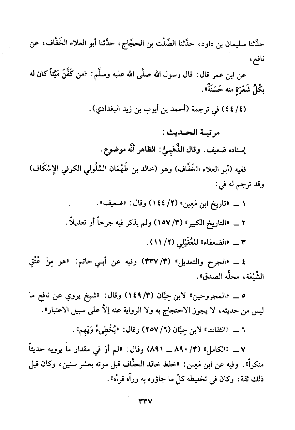 ٥ - "المجروحين" لابن حِبَّان (٣/ ١٤٩) وقال: "شيخ يروي عن نافع ما ليس من حديثه، لا يجوز الاحتجاج به ولا الرواية عنه إلَّا على سبيل الاعتبار".