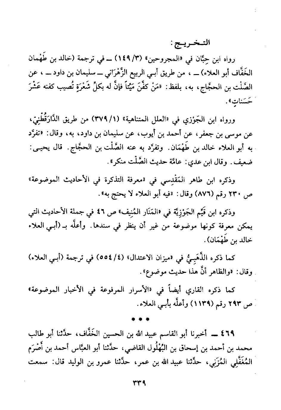 وذكره ابن قَيِّم الجَوْزِيَّة في "المَنَار المُنِيف" ص ٤٦ في جملة الأحاديث التي يمكن معرفة كونها موضوعة من غير أن ينظر في سندها. وأعلَّه بـ (أبي العلاء خالد بن طَهْمَان).