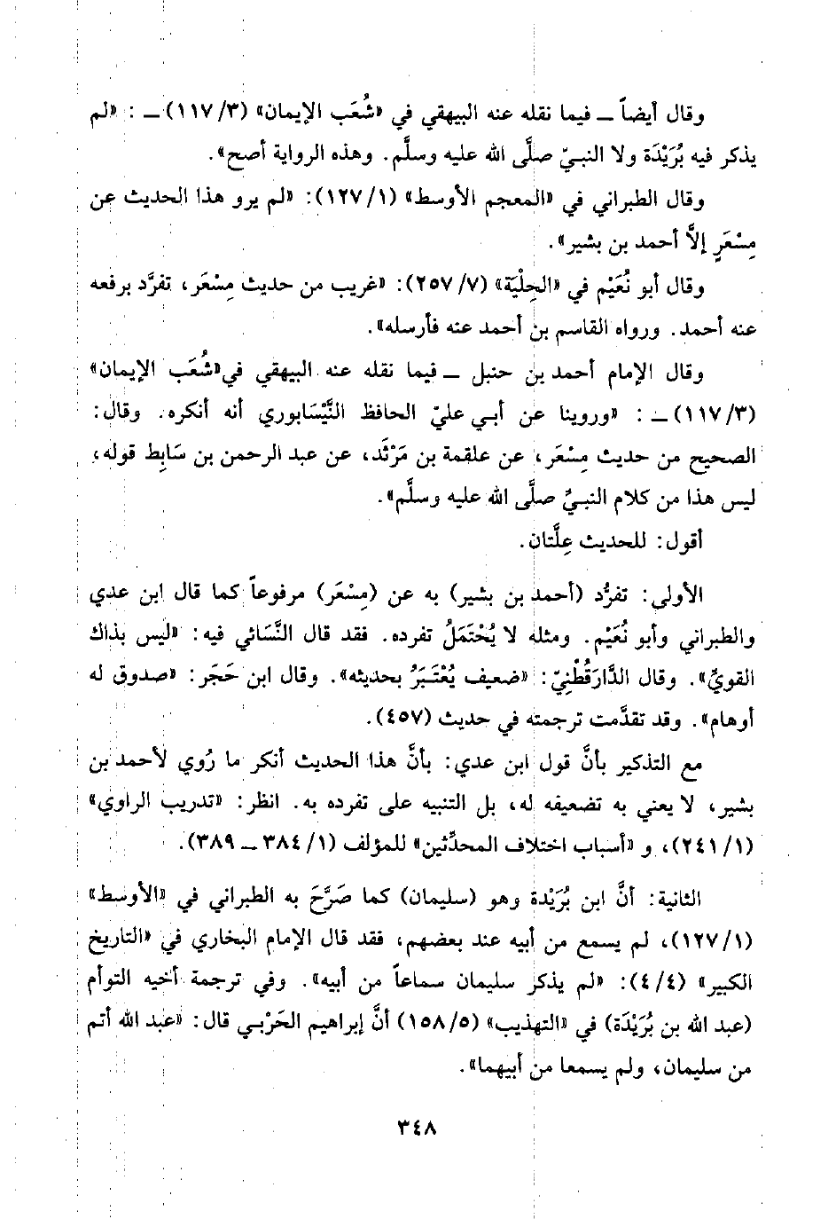 الثانية: أنَّ ابن بُرَيْدة وهو (سليمان) كما صَرَّحَ به الطبراني في "الأوسط" (١/ ١٢٧)، لم يسمع من أبيه عند بعضهم، فقد قال الإمام البخاري في "التاريخ الكبير" (٤/ ٤): "لم يذكر سليمان سماعًا من أبيه". وفي ترجمة أخيه التوأم (عبد اللَّه بن بُرَيْدَة) في "التهذيب" (٥/ ١٥٨) أنَّ إبراهيم الحَرْبي قال: "عبد اللَّه أتم من سليمان، ولم يسمعا من أبيهما".