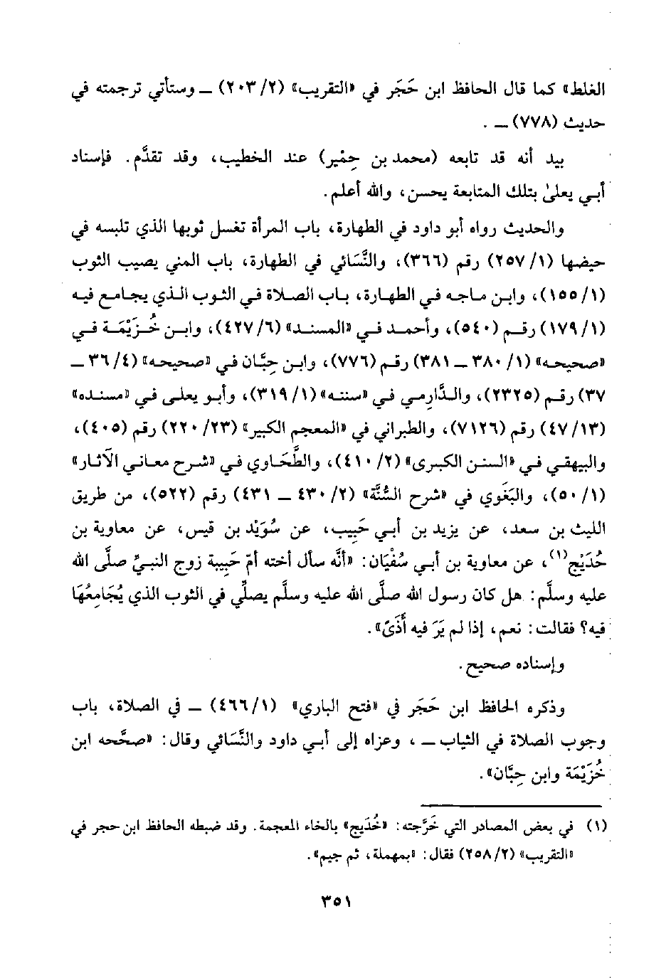 والحديث رواه أبو داود في الطهارة، باب المرأة تغسل ثوبها الذي تلبسه في حيضها (١/ ٢٥٧) رقم (٣٦٦)، والنَّسَائي في الطهارة، باب المني يصيب الثوب (١/ ١٥٥)، وابن ماجه في الطهارة، باب الصلاة في الثوب الذي يجامع فيه (١/ ١٧٩) رقم (٥٤٠)، وأحمد في "المسند" (٦/ ٤٢٧)، وابن خُزَيْمَة في "صحيحه" (١/ ٣٨٠ - ٣٨١) رقم (٧٧٦)، وابن حِبَّان في "صحيحه" (٤/ ٣٦ - ٣٧) رقم (٢٣٢٥)، والدَّارِمي في "سننه" (١/ ٣١٩)، وأبو يعلى في "مسنده" (١٣/ ٤٧) رقم (٧١٢٦)، والطبراني في "المعجم الكبير" (٢٣/ ٢٢٠) رقم (٤٠٥)، والبيهقي في "السنن الكبرى" (٢/ ٤١٠)، والطَّحَاوي في "شرح معاني الآثار" (١/ ٥٠)، والبغوي في "شرح السُّنَّة" (٢/ ٤٣٠ - ٤٣١) رقم (٥٢٢)، من طريق الليث بن سعد، عن يزيد بن أبي حَبِيب، عن سُوَيْد بن قيس، عن معاوية بن حُدَيْج (¬١)، عن معاوية بن أبي سُفْيَان: "أنَّه سأل أخته أمّ حَبِيبة زوج النبيِّ صلَّى اللَّه عليه وسلَّم: هل كان رسول اللَّه صلَّى اللَّه عليه وسلَّم يصلِّي في الثوب الذي يُجَامِعُهَا فيه؟ فقالت: نعم، إذا لم يَرَ فيه أَذًى".