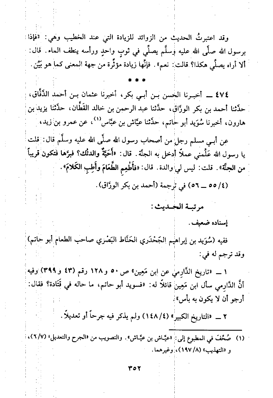 ٤٧٤ - أخبرنا الحسن بن أبي بكر، أخبرنا عثمان بن أحمد الدَّقَّاق، حدَّثنا أحمد بن بكر الورَّاق، حدَّثنا عبد الرحمن بن خالد القَطَّان، حدَّثنا يزيد بن هارون، أخبرنا سُوَيد أبو حاتم، حدَّثنا عيَّاش بن عبَّاس (¬١)، عن عمرو بن زيد،