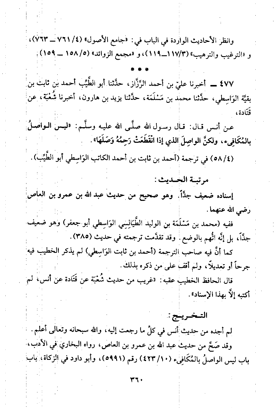 وقد صَحَّ من حديث عبد اللَّه بن عمرو بن العاص، رواه البخاري في الأدب، باب ليس الواصلُ بالمُكَافِئ (١٠/ ٤٢٣) رقم (٥٩٩١)، وأبو داود في الزكاة، باب