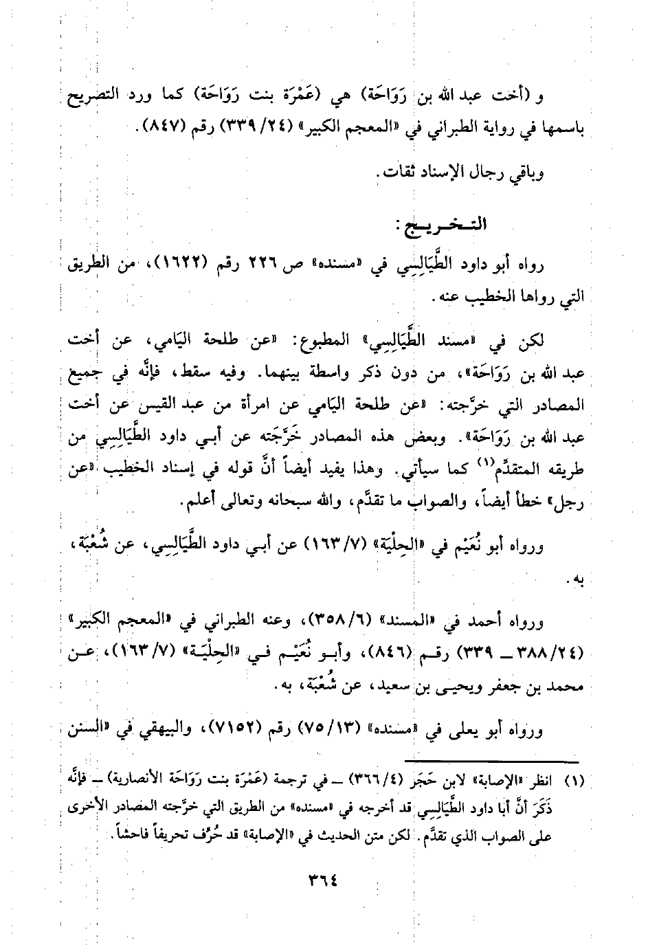 (¬١) انظر "الإصابة" لابن حَجَر (٤/ ٣٦٦) -في ترجمة (عَمْرَة بنت رَوَاحَة الأنصارية) - فإنَّه ذَكَرَ أنَّ أبا داود الطَّيَالِسِي قد أخرجه في "مسنده" من الطريق التي خرَّجته المصادر الأخرى على الصواب الذي تقدَّم. لكن متن الحديث في "الإصابة" قد حُرِّف تحريفًا فاحشًا.