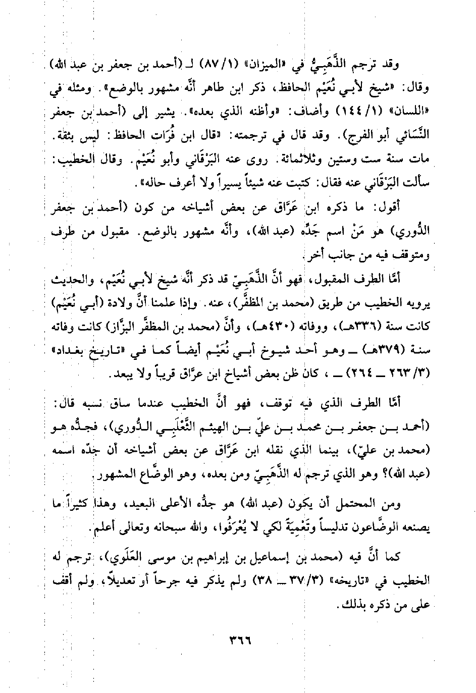 أمَّا الطرف المقبول، فهو أنَّ الذَّهَبِيّ قد ذكر أنَّه شيخ لأبي نُعَيْم، والحديث يرويه الخطيب من طريق (محمد بن المظفَّر)، عنه. وإذا علمنا أنَّ ولادة (أبي نُعَيْم) كانت سنة (٣٣٦ هـ)، ووفاته (٤٣٠ هـ)، وأنَّ (محمد بن المظفَّر البزَّاز) كانت وفاته سنة (٣٧٩ هـ) -وهو أحد شيوخ أبي نُعَيْم أيضًا كما في "تاريخ بغداد" (٣/ ٢٦٣ - ٢٦٤) -، كان ظن بعض أشياخ ابن عرَّاق قريبًا ولا يبعد.