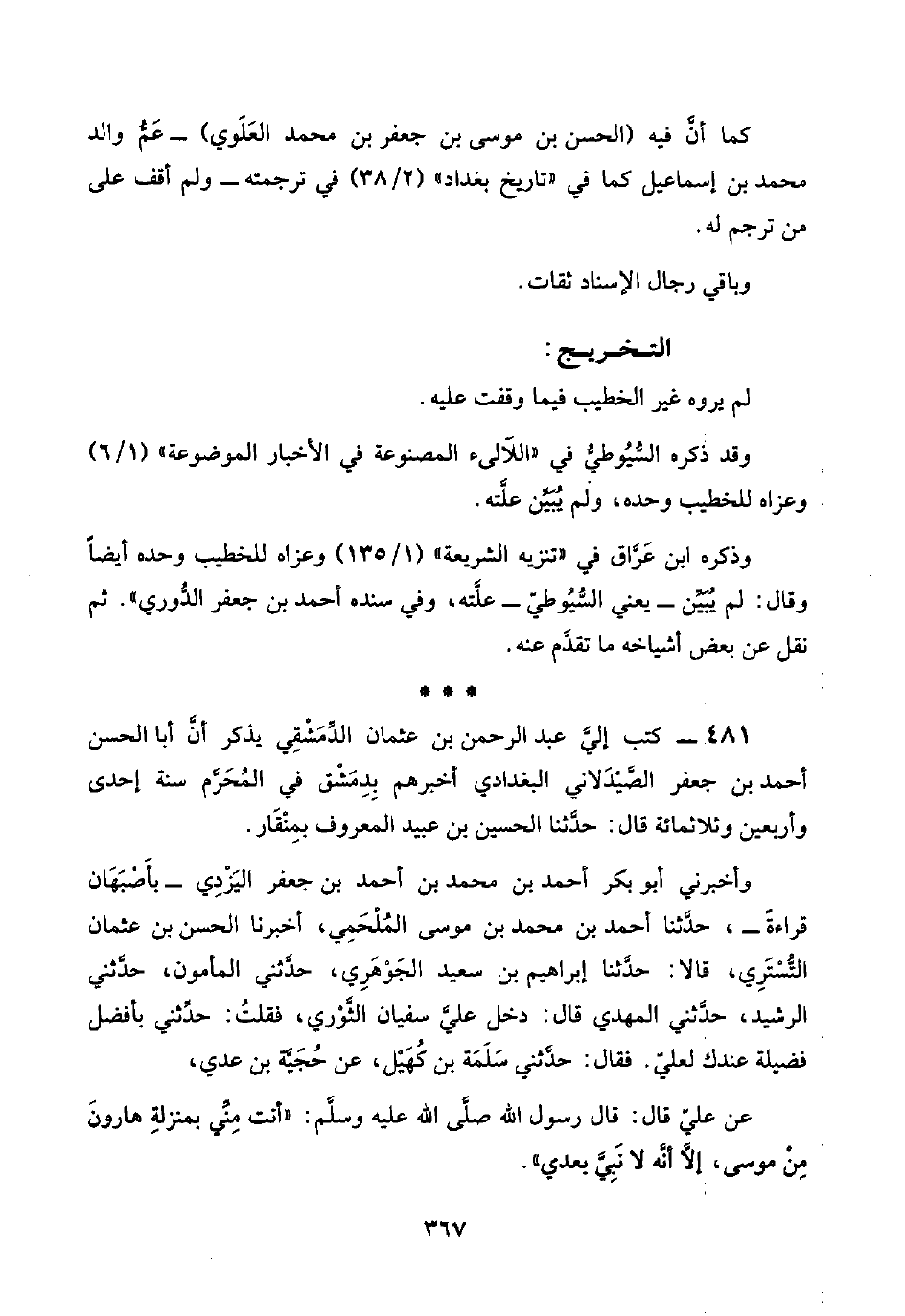 وأخبرني أبو بكر أحمد بن محمد بن أحمد بن جعفر اليَزْدِي -بأَصْبَهَان قراءةً-، حدَّثنا أحمد بن محمد بن موسى المُلْحَمِي، أخبرنا الحسن بن عثمان التُّسْتَرِي، قالا: حدَّثنا إبراهيم بن سعيد الجَوْهَرِي، حدَّثني المأمون، حدَّثني الرشيد، حدَّثني المهدي قال: دخل عليَّ سفيان الثَّوْري، فقلتُ: حدِّثني بأفضل فضيلة عندك لعليّ. فقال: حدَّثني سَلَمَة بن كُهَيْل، عن حُجَيَّة بن عدي،