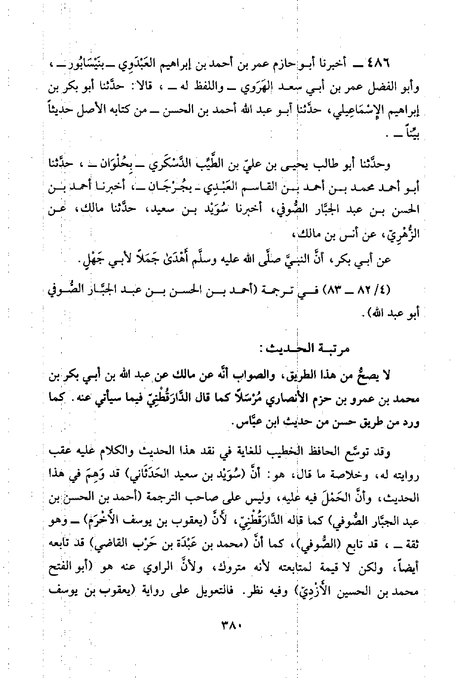 ٤٨٦ - أخبرنا أبو حازم عمر بن أحمد بن إبراهيم العَبْدَوِي -بنَيْسَابُور-، وأبو الفضل عمر بن أبي سعد الهَرَوي -واللفظ له-، قالا: حدَّثنا أبو بكر بن إبراهيم الإِسْمَاعِيلي، حدَّثنا أبو عبد اللَّه أحمد بن الحسن -من كتابه الأصل حديثًا بيِّنًا-.