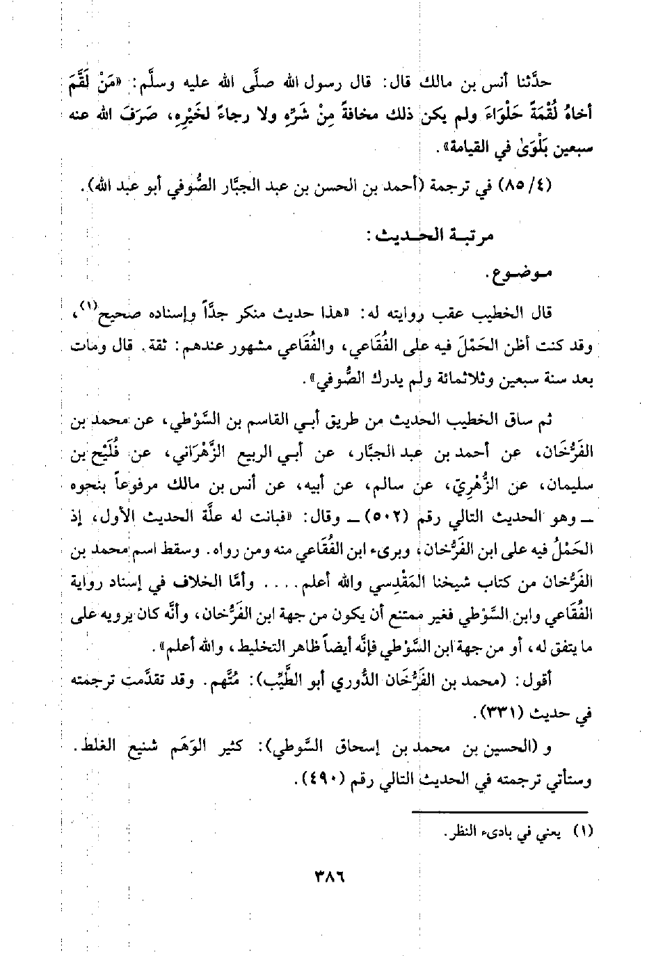 و(الحسين بن محمد بن إسحاق السَّوطي): كثير الوَهَم شنيع الغلط. وستأتي ترجمته في الحديث التالي رقم (٤٩٠).