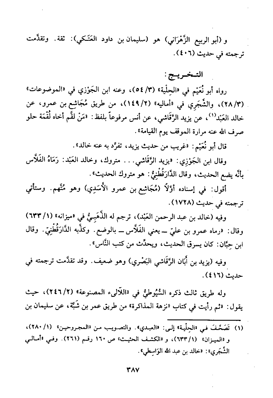 وقال ابن الجَوْزِي: "يزيد الرَّقَاشي. . . متروك، وخالد العَبْد: رَمَاهُ الفَلَّاس بأنَّه يضع الحديث، وقال الدَّارَقُطْنِيُّ: هو متروك الحديث".