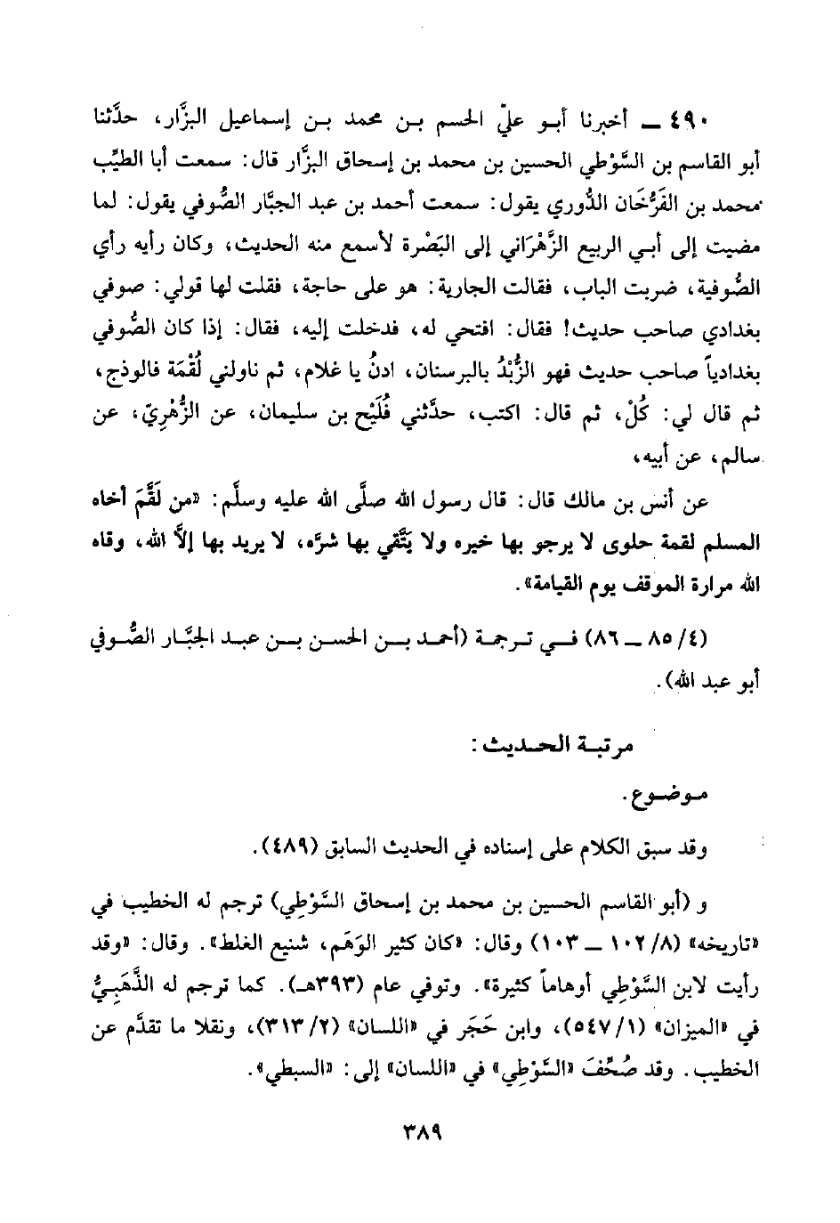 ٤٩٠ - أخبرنا أبو عليّ الحسم بن محمد بن إسماعيل البزَّار، حدَّثنا أبو القاسم بن السَّوْطي الحسين بن محمد بن إسحاق البزَّار قال: سمعت أبا الطيِّب محمد بن الفَرُّخَان الدُّوري يقول: سمعت أحمد بن عبد الجبَّار الصُّوفي يقول: لما مضيت إلى أبي الربيع الزَّهْرَاني إلى البَصْرة لأسمع منه الحديث، وكان رأيه رأي الصُّوفية، ضربت الباب، فقالت الجارية: هو على حاجة، فقلت لها قولي: صوفي بغدادي صاحب حديث! فقال: افتحي له، فدخلت إليه، فقال: إذا كان الصُّوفي بغداديًا صاحب حديث فهو الزُّبْدُ بالبرسنان، ادنُ يا غلام، ثم ناولني لُقْمَة فالوذج، ثم قال لي: كُلْ، ثم قال: اكتب، حدَّثني فُلَيْح بن سليمان، عن الزُّهْرِيّ، عن سالم، عن أبيه،