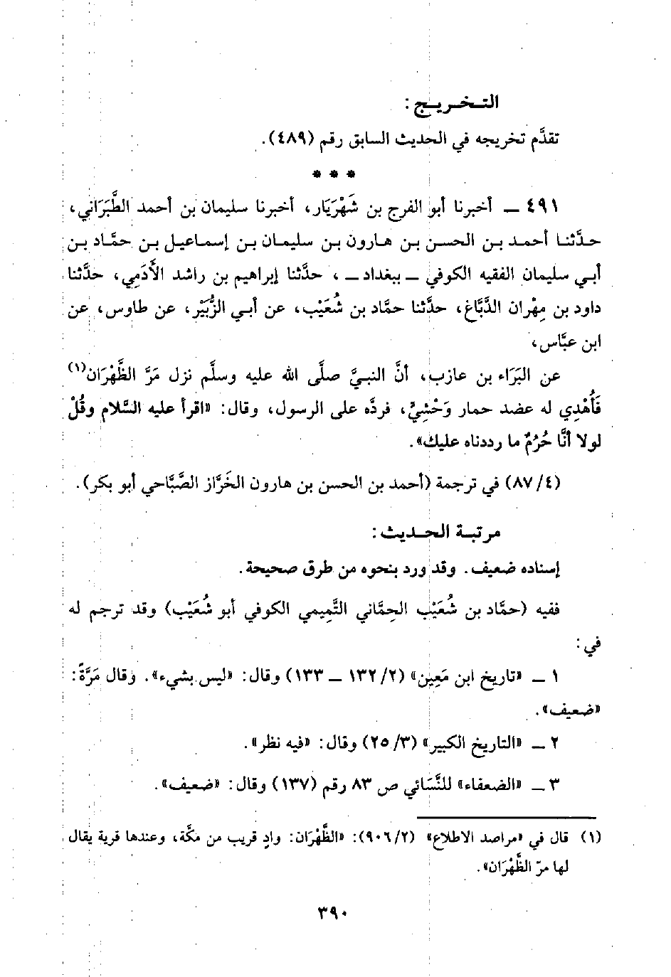 ٤٩١ - أخبرنا أبو الفرج بن شَهْرَيَار، أخبرنا سليمان بن أحمد الطَّبَرَاني، حدَّثنا أحمد بن الحسن بن هارون بن سليمان بن إسماعيل بن حمَّاد بن أبي سليمان الفقيه الكوفي -ببغداد-، حدَّثنا إبراهيم بن راشد الأَدَمِي، حدَّثنا داود بن مِهْران الدَّبَّاغ، حدَّثنا حمَّاد بن شُعَيْب، عن أبي الزُّبَيْر، عن طاوس، عن ابن عبَّاس،