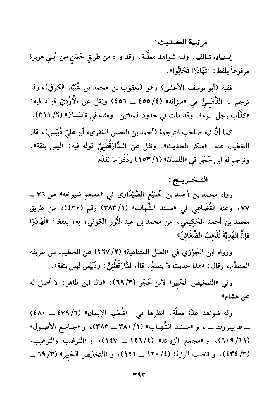 رواه محمد بن أحمد بن جُمَيْع الصَّيْدَاوي في "معجم شيوخه" ص ٧٦ - ٧٧، وعنه القُضَاعِي في "مسند الشِّهاب" (١/ ٣٨٣) رقم (٤٣٠)، من طريق محمد بن أحمد الحَكِيمي، عن محمد بن عبد النُّور الكوفي، به، بلفظ: "تَهَادَوْا فإنَّ الهَدِيَّةَ تُذْهِبُ الضَّغَائِنَ".