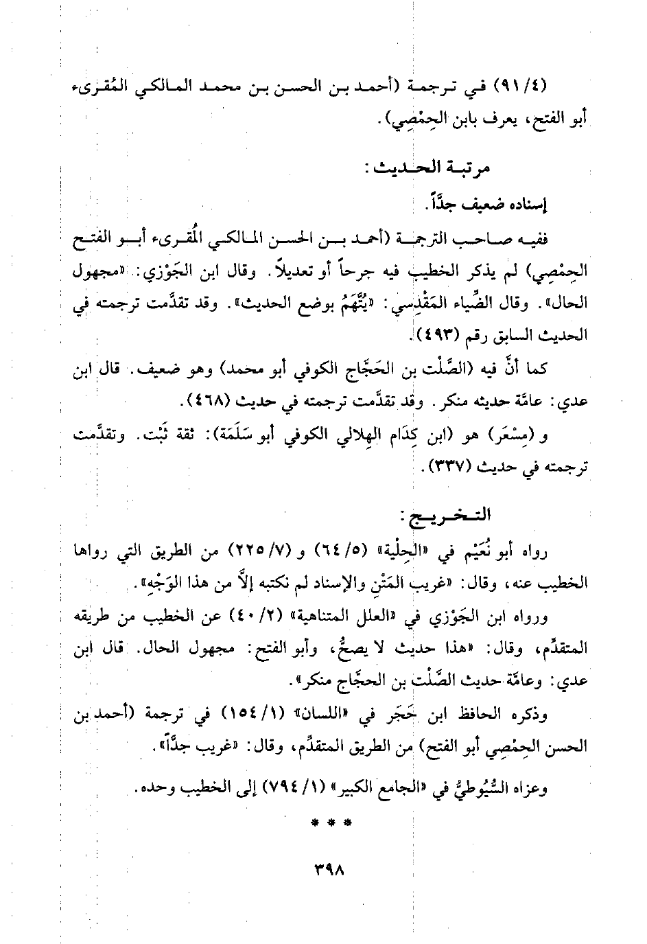 ففيه صاحب الترجمة (أحمد بن الحسن المالكي المُقرئ أبو الفتح الحِمْصِي) لم يذكر الخطيب فيه جرحًا أو تعديلًا. وقال ابن الجَوْزي: "مجهول الحال". وقال الضِّياء المَقْدِسي: "يُتَّهَمُ بوضع الحديث". وقد تقدَّمت ترجمته في الحديث السابق رقم (٤٩٣).