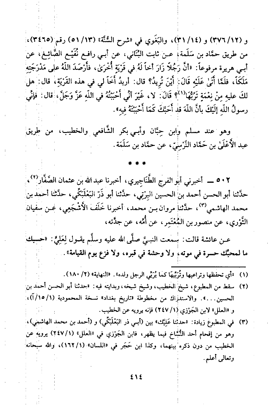 و ١٢/ ٣٧٦) و (١٤/ ٣١)، والبَغَوي في "شرح السُّنَّة" (١٣/ ٥١) رقم (٣٤٦٥)، من طريق حمَّاد بن سلمة، عن ثابت البُنَاني، عن أبي رافع نُفَيْع الصَّائِغ، عن أبي هريرة مرفوعًا: "أنَّ رجلًا زَارَ أخًا لَهُ في قَرْيَةٍ أُخْرَى، فأَرْصَدَ اللَّهُ على مَدْرَجَتِهِ مَلَكًا، فلَمَّا أَتَى عَلَيْهِ قَالَ: أَيْنَ تُرِيدُ؟ قال: أريدُ أَخًا لي في هذه القَرْيَةِ، قال: هل لكَ عليهِ مِنْ نِعْمَةٍ تَرُبُّهَا (¬١)؟ قَالَ: لا، غَيْرَ أنِّي أَحْبَبْتُهُ في اللَّهِ عَزَّ وَجَلَّ، قال: فإنِّي رسولُ اللَّهِ إلَيْكَ بأنَّ اللَّهَ قد أَحَبَّكَ كَمَا أَحْبَبْتَهُ فِيهِ".