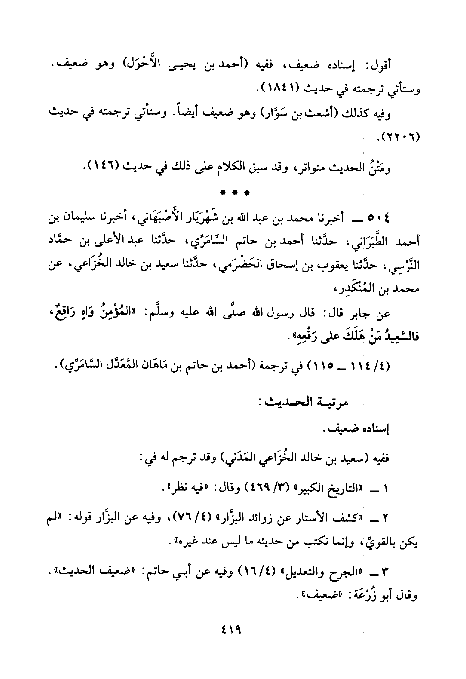 عن جابر قال: قال رسول اللَّه صلَّى اللَّه عليه وسلَّم: "المُؤْمِنُ وَاهٍ رَاقِعٌ، فالسَّعِيدُ مَنْ هَلَكَ على رَقْعِهِ".