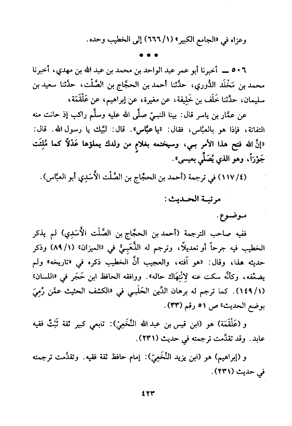 ٥٠٦ - أخبرنا أبو عمر عبد الواحد بن محمد بن عبد اللَّه بن مهدي، أخبرنا محمد بن مَخْلَد الدُّوري، حدَّثنا أحمد بن الحجَّاج بن الصَّلْت، حدَّثنا سعيد بن سليمان، حدَّثنا خَلَف بن خَلِيفة، عن مغيرة، عن إبراهيم، عن عَلْقَمَة،