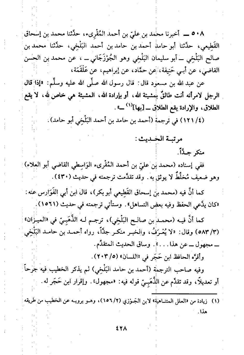 ٥٠٨ - أخبرنا محمد بن عليّ بن أحمد المُقْرِئ، حدَّثنا محمد بن إسحاق القَطِيعي، حدَّثنا أبو حامد أحمد بن حامد بن أحمد البَلْخِي، حدَّثنا محمد بن صالح البَلْخِي -أبو سليمان البَلْخِي وهو الجُوْزَجَاني-، عن محمد بن الحسن القاضي، عن أبي حَنِيفة، عن حمَّاد، عن إبراهيم، عن عَلْقَمَة،