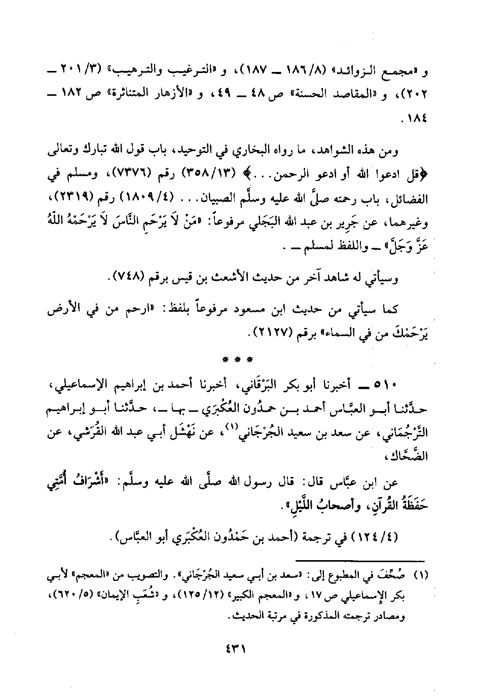 ٥١٠ - أخبرنا أبو بكر البَرْقَاني، أخبرنا أحمد بن إبراهيم الإسماعيلي، حدَّثنا أبو العبَّاس أحمد بن حمدُون العُكْبَري -بها-، حدَّثنا أبو إبراهيم التَّرْجُمَاني، عن سعد بن سعيد الجُرْجَاني (¬١)، عن نَهْشَل أبي عبد اللَّه القُرَشي، عن الضَّحَّاك،