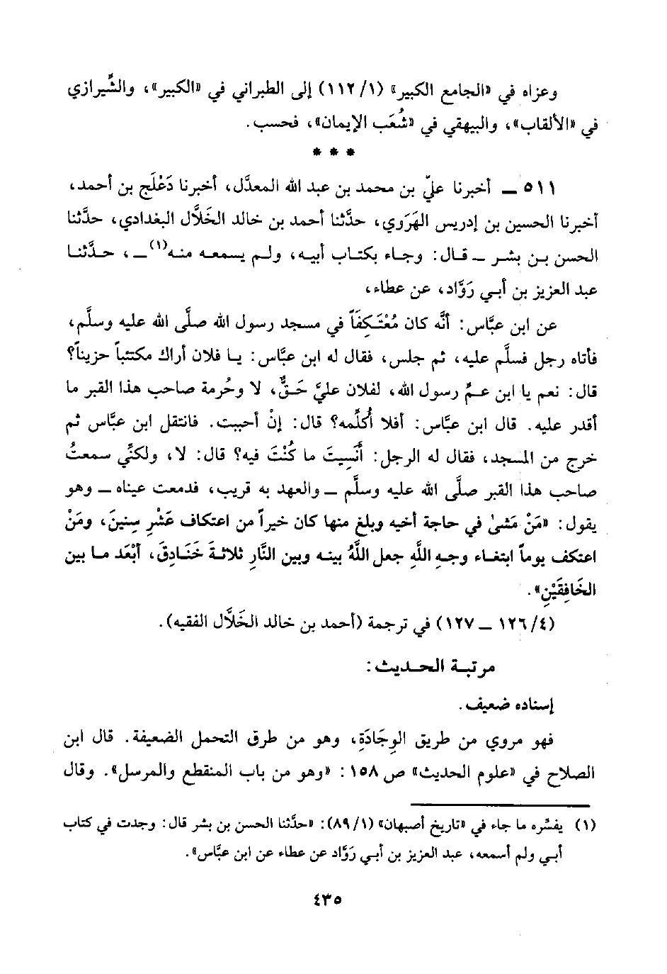 ٥١١ - أخبرنا عليّ بن محمد بن عبد اللَّه المعدّل، أخبرنا دَعْلَج بن أحمد، أخبرنا الحسين بن إدريس الهَرَوي، حدَّثنا أحمد بن خالد الخَلَّال البغدادي، حدَّثنا الحسن بن بشر -قال: وجاء بكتاب أبيه، ولم يسمعه منه (¬١) -، حدَّثنا عبد العزيز بن أبي رَوَّاد، عن عطاء،