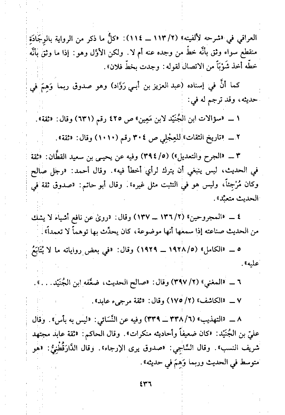 ٨ - "التهذيب" (٦/ ٣٣٨ - ٣٣٩) وفيه عن النَّسَائي: "ليس به بأس". وقال عليّ بن الجُنَيْد: "كان ضعيفًا وأحاديثه منكرات". وقال الحاكم: "ثقة عابد مجتهد شريف النسب". وقال السَّاجِي: "صدوق يرى الإرجاء". وقال الدَّارَقُطْنِيُّ: " هو متوسط في الحديث وربما وَهِمَ في حديثه".
