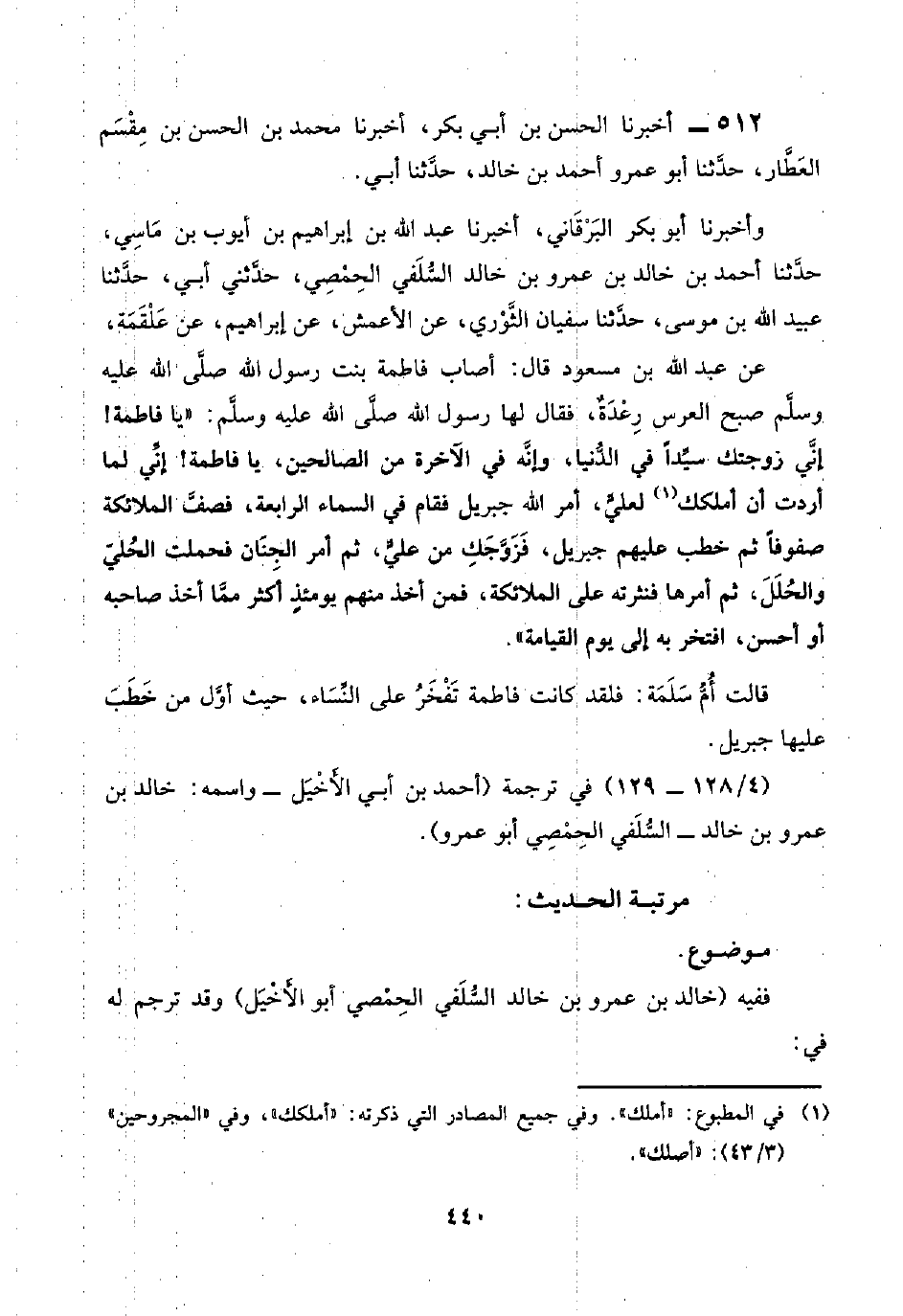 ٥١٢ - أخبرنا الحسن بن أبي بكر، أخبرنا محمد بن الحسن بن مِقْسَم العَطَّار، حدَّثنا أبو عمرو أحمد بن خالد، حدَّثنا أبي.