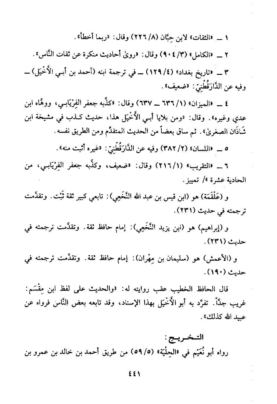 ٤ - "الميزان" (١/ ٦٣٦ - ٦٣٧) وقال: "كذَّبه جعفر الفِرْيَابي، ووهَّاه ابن عدي وغيره". وقال: "ومن بلايا أبي الأَخْيَل هذا، حديث كذب في مشيخة ابن شَاذَان الصغرى". ثم ساق بعضًا من الحديث المتقدِّم ومن الطريق نفسه.