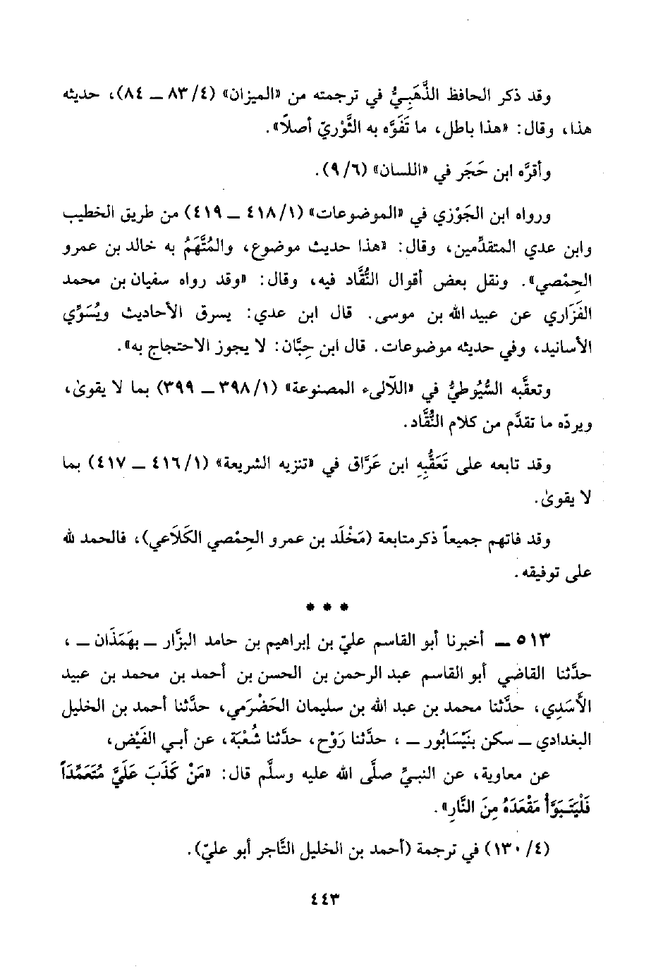 ورواه ابن الجَوْزي في "الموضوعات" (١/ ٤١٨ - ٤١٩) من طريق الخطيب وابن عدي المتقدِّمين، وقال: "هذا حديث موضوع، والمُتَّهَمُ به خالد بن عمرو الحِمْصي". ونقل بعض أقوال النُّقَّاد فيه، وقال: "وقد رواه سفيان بن محمد الفَزَاري عن عبيد اللَّه بن موسى. قال ابن عدي: يسرق الأحاديث ويُسَوِّي الأسانيد، وفي حديثه موضوعات. قال ابن حِبَّان: لا يجوز الاحتجاج به".