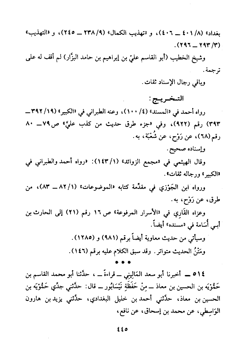 ٥١٤ - أخبرنا أبو سعد المَالِينِي -قراءةً-، حدَّثنا أبو محمد القاسم بن حَمُّوْيَه بن الحسين بن معاذ -مِنْ حَفَظَةِ نَيْسَابُور- قال: حدَّثني جدِّي حَمُّوْيَه بن الحسين بن معاذ، حدَّثني أحمد بن خليل البغدادي، حدَّثني يزيد بن هارون الوَاسِطي، عن محمد بن إسحاق، عن نافع،